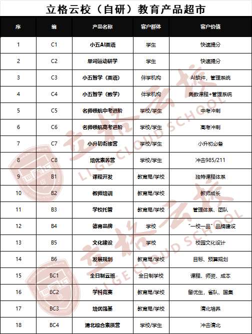 立格云校凭借对教育规律的深刻理解,推出县中振兴、区域教育一体化解决方案,覆盖小学、初中、高中全学段,包括拔尖创新人才培养课程体系、全日制云班、AI教室等18大核心教育场景解决方案。