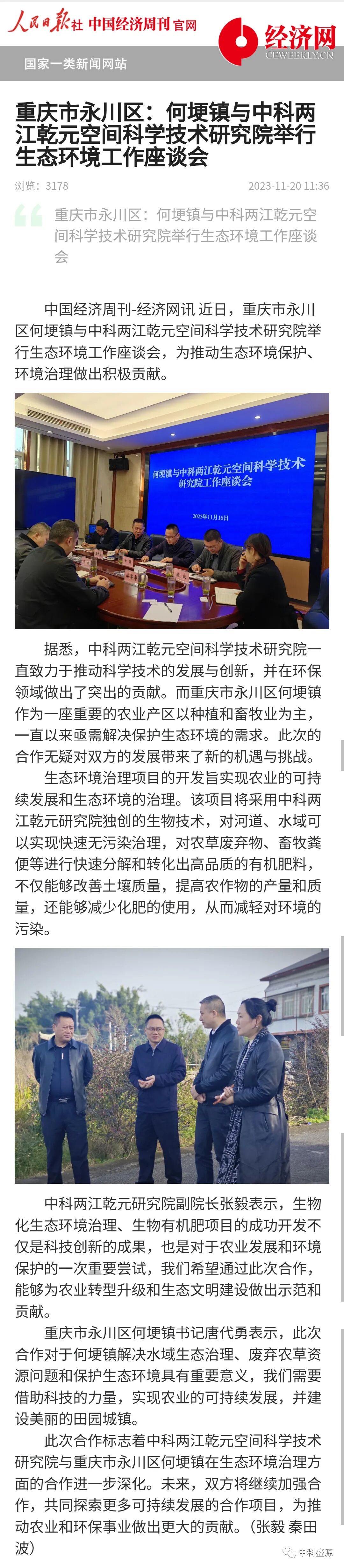 人民日报经济网报道:何埂镇与中科两江乾元空间科学技术研究院举行生态环境工作座谈会