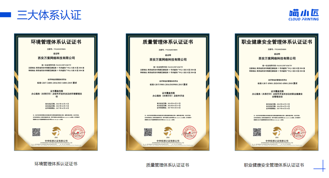 喵小匠隶属于西安万紫网络科技有限公司,成立于2011年,拥有自主研发的软硬件系统、八大专利证书,并通过三大体系认证(质量、环境、职业健康安全),是一家真正的技术驱动型企业。