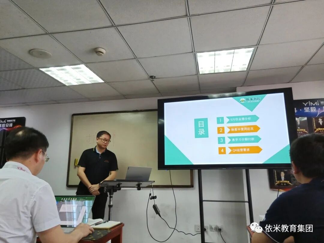 接下来,财务、人力资源、教研、教学、运营部门负责人分别就其部门进行Q3工作汇报及Q4重点工作部署。过程中,王鼎老师对税务和财务系统进行了详细的说明;孙以琳老师介绍了Q4科学和数学学科工作,强调了我们产品的优势和定位;于在中老师汇报了各校区的退费情况、续班率以及排课和课消情况;胡慰伦老师对9月份的业绩以及脉客丰的使用近况进行了分析;贾杨青老师向我们现场展示了电子合同的具体操作流程。每位老师的汇报都有着大量的数据做支撑,翔实的数据在反映相关问题的同时,也为以后的工作指明了方向。
