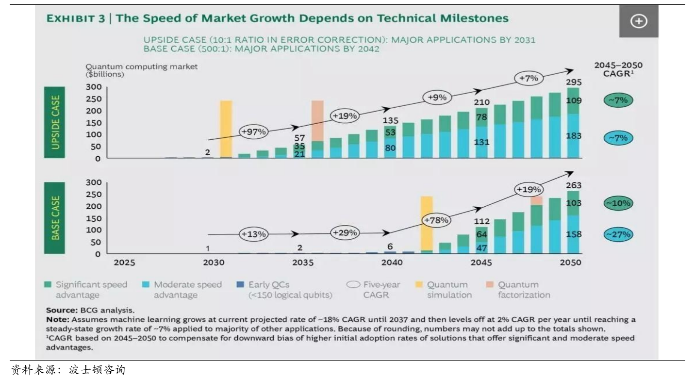如果物理量子位的错误率这一瓶颈能够克服,错误率显著降低,那么到2035年,量子计算市场规模将达到600亿美元,并在2050年增加到2950亿美元。