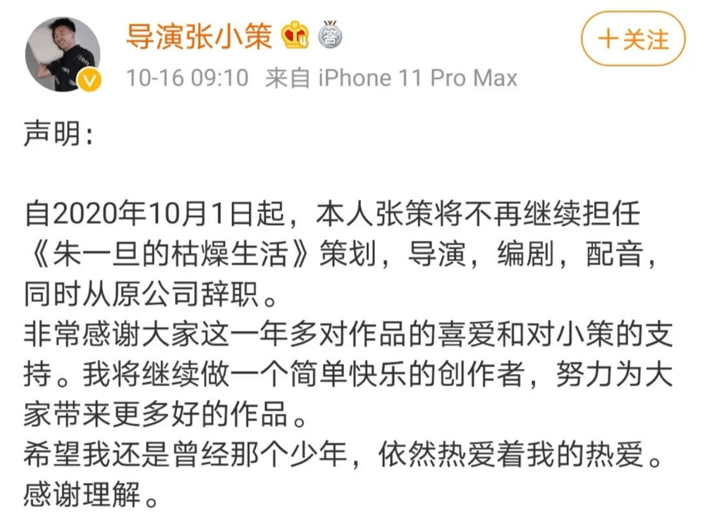 张策也没给大众议论吃瓜的机会,很快“官宣”解答了疑问。10月16日上午,张策正式发微博表示,已在月初从原公司离职,不再担任《朱一旦的枯燥生活》系列视频的策划、导演、编剧、配音,回归为简单快乐的创作者。