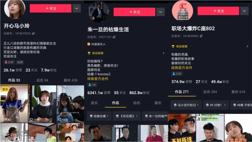 张策也进行过成为“台前”知名网红的尝试,但一直以来张策的独立账号流量远远低于“朱一旦”,其自身也并没有成功打造出个人IP,如没有头部网红的引流就没有什么关注。而依托“朱一旦”打造出来的矩阵号开心马小玲、职场大爆炸C座802等,张策也只是更多的以幕后身份参与。