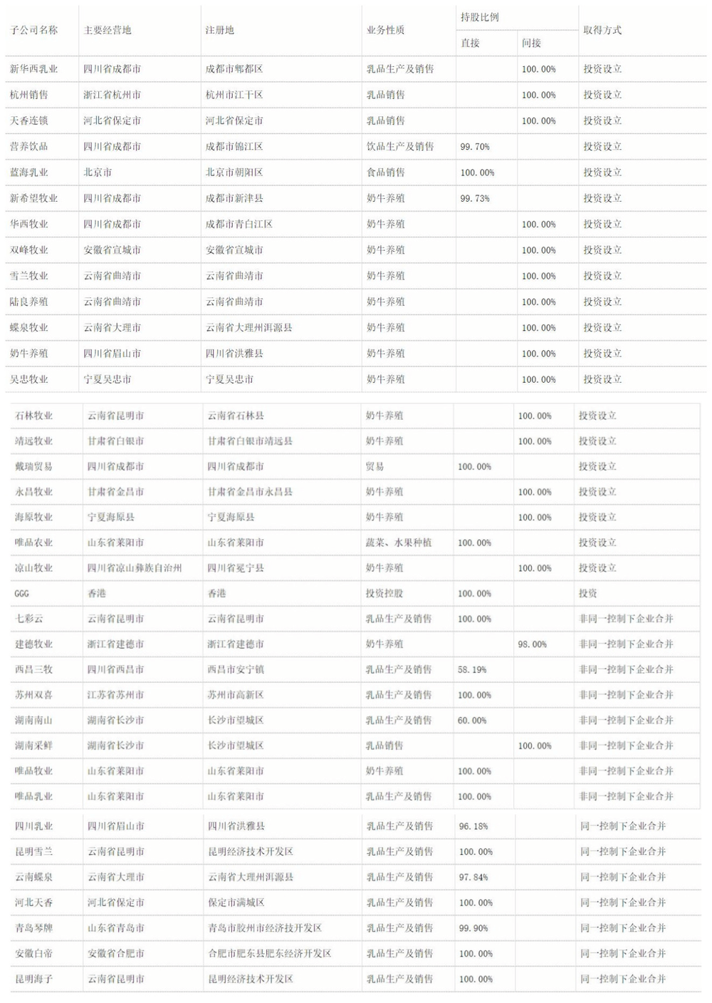 截止目前,新希望乳业拥有不同品牌的13家乳品企业和11个奶源基地。主营业务由30多家家参控股子公司承担,主要包括乳制品生产及销售公司和牧场。