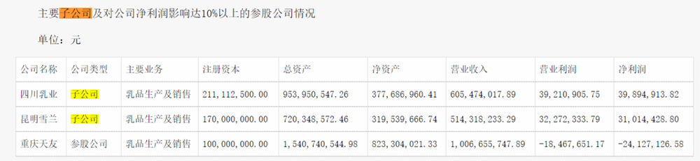 除此以外,新希望乳业旗下子公司的业绩也堪忧。众多子公司中,只有两家企业能为母公司贡献超过10%的利润,分别是四川乳业和昆明雪兰,其它子公司或微利,或亏损。