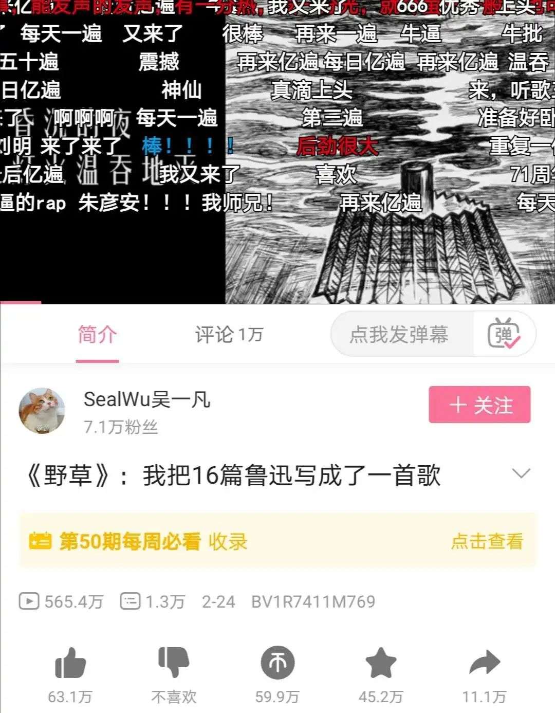 在节目诞生之前,B站就有了说唱区,许多UP主在此投稿。其中一位来自北京大学的研究生UP主@SealWu吴一凡,就曾将鲁迅的16篇散文诗写成了说唱内容,获得了超过500万的B站播放量。