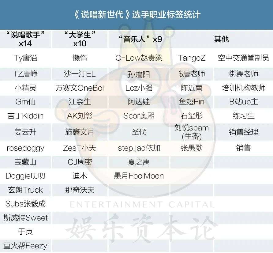 这一点首先就体现在《说唱新世代》中有众多“非典型”说唱歌手上。按照节目花字标示的选手职业,我们看到有在校大学生、练习生、销售、教师、空中交通管制员,甚至是B站up主。在40位亮相的选手中,有“说唱歌手”职业标签的不过14位。