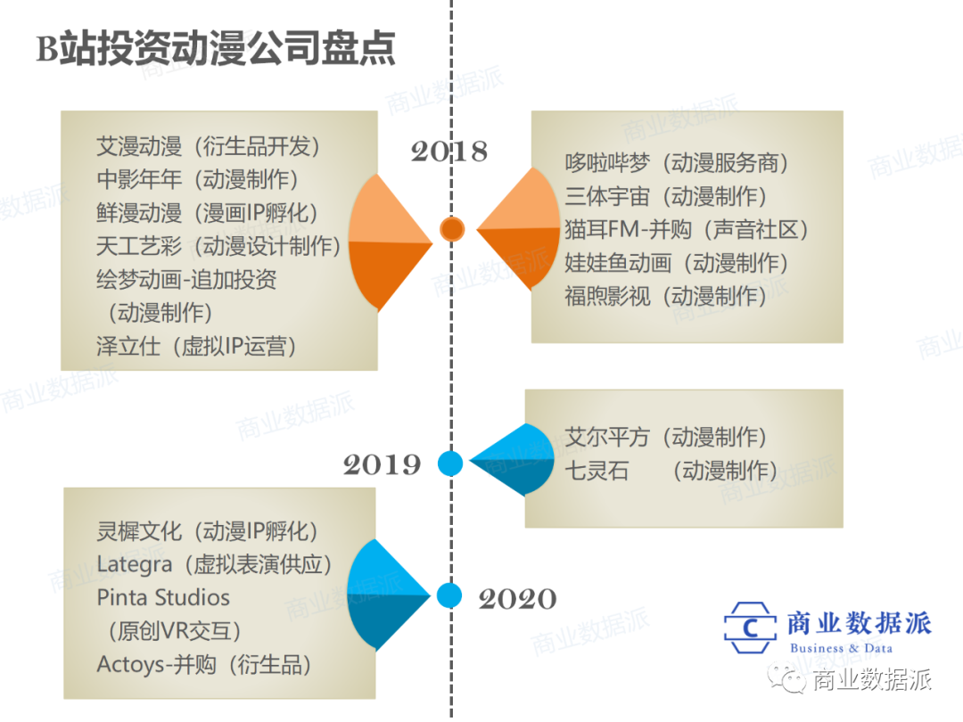 2018年至今,B站一口气投资了至少17家动漫及其衍生产业。其中包括中影年年、七灵石等8家动漫制作公司,泽立仕、Lategra两家虚拟IP运营商,以及并购了声音社区猫耳FM和二次元企业Actoys,与绘梦动画共同成立了哆啦哔梦……