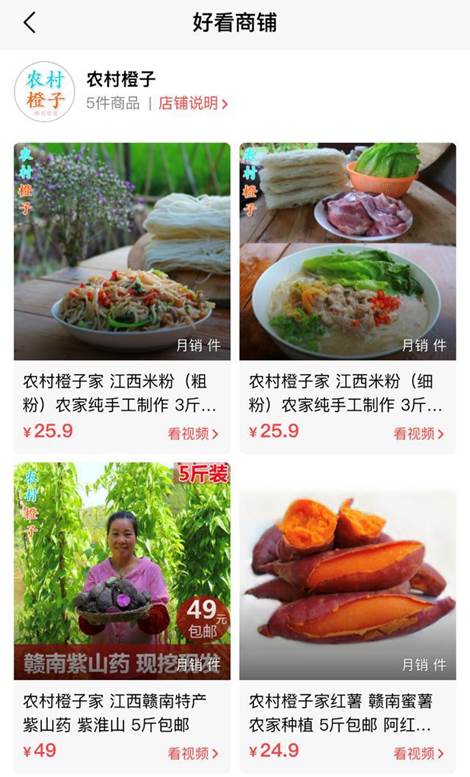 农村橙子不仅通过视频本身的流量获得了丰厚平台收益,她还将好看视频作为电商创业的起点,为自己的农特产品打开销路。粉丝们从她的视频中了解到了赣南脐橙、赣南蜜薯等一系列农副产品的滋味和品质,而真实镜头也增强了互信。