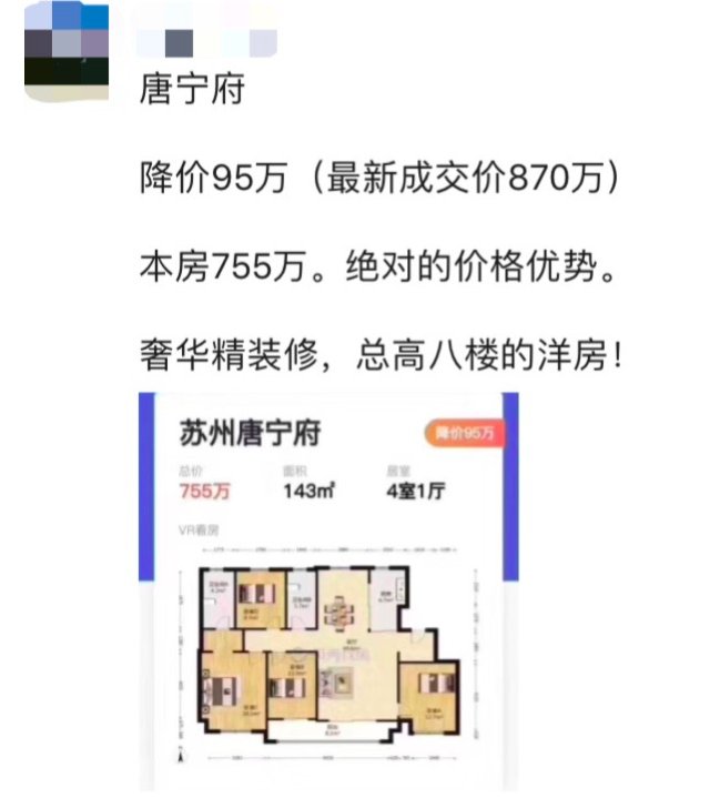 当年的苏州园区限价神盘唐宁府,大户型一路从900万降到870万,再降到755万,如今700万也有人紧急抛售。