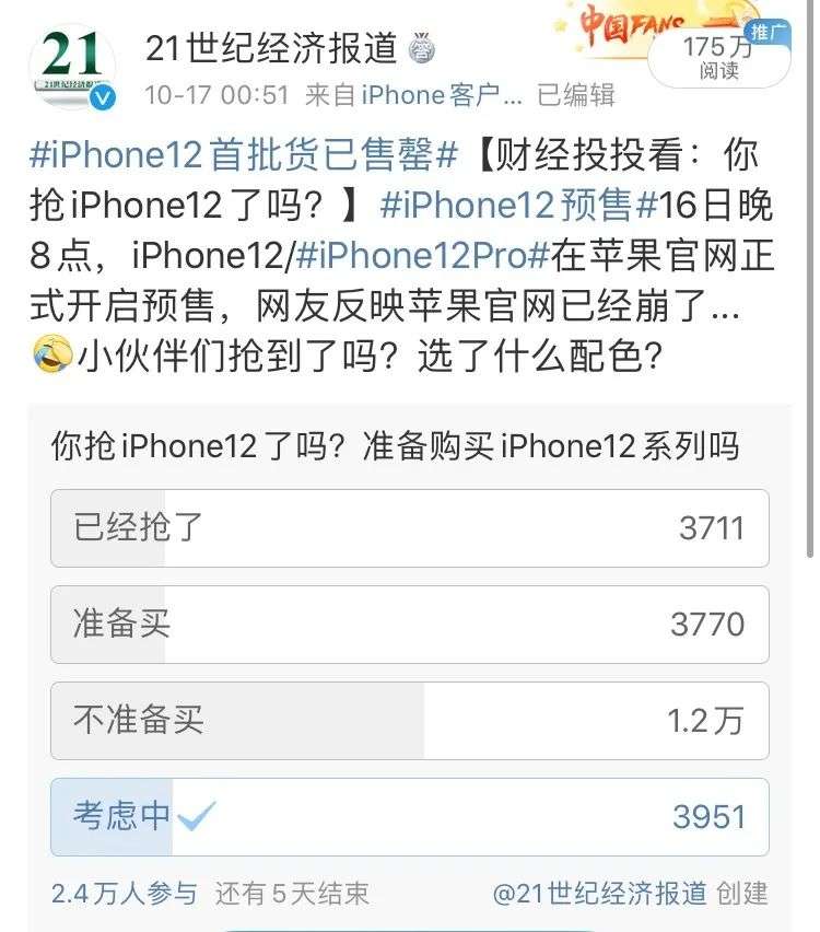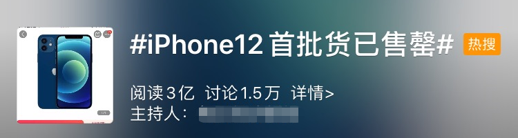 10月16日晚上,iPhone12开启线上预售,电商首批货瞬间售罄,苹果中国官网一度崩溃,相关话题霸屏当天及周末的微博热搜榜。