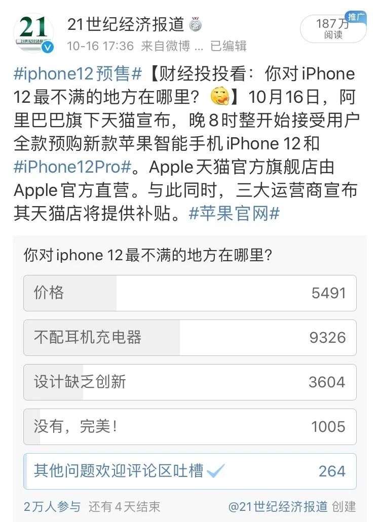 事实上,早在此前传出iPhone 12系列可能不再配有电源适配器和耳机时,就曾引起网友热议,而在发布会证实这一消息以及预售开启后,网友们的反应更为强烈。