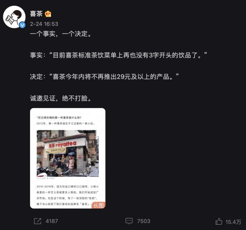 2022年2月,以高端形象深入人心的喜茶宣布降价,并表示:“喜茶今年内将不再推出29元及以上的产品”。3月,奈雪的茶官宣降价,推出亲民系列的同时对30元以上产品价格进行下调,“奈雪大幅降价10元”一度登上微博热搜榜前列。