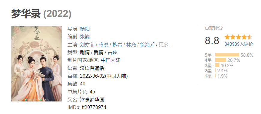 与此同时,这部剧在豆瓣的评分更是从开画 8.3 分一路飙升到 8.8 分,要知道曾经的神剧《甄嬛传》,也才 9.3 分。