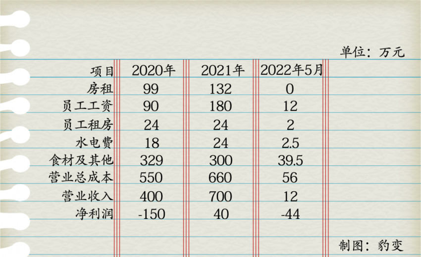 2020年,因为疫情影响,餐馆断断续续有5个月没正常营业,营业额直接砍半,掉到了400万,这一年亏损100多万。