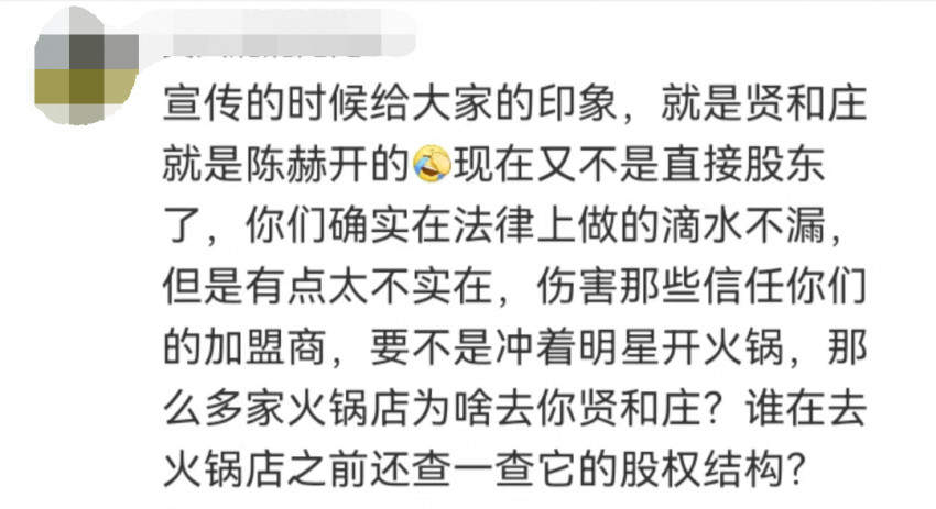 在这篇文章中,贤合庄火锅多个加盟商来到成都总店门口进行维权的画面,再加上陈赫退出贤合庄餐饮等股权变动,确实让人很难不去联想。