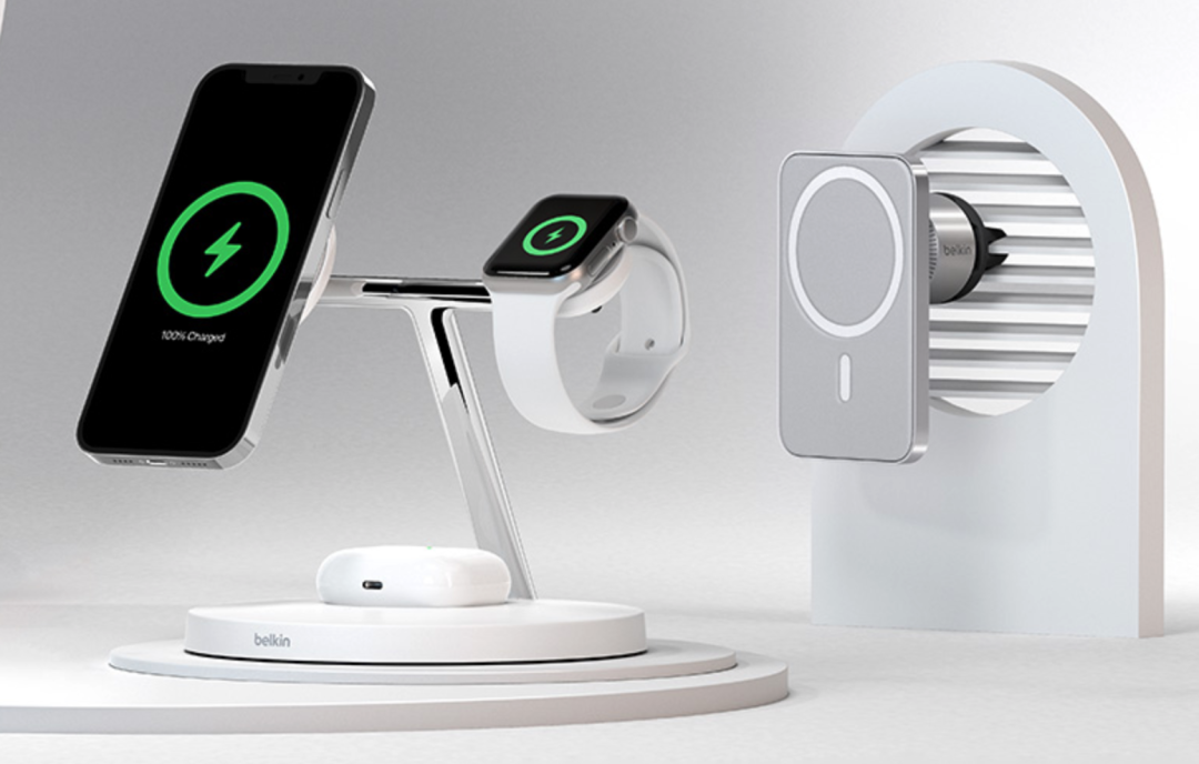 苹果表示未来会有更多第三方配件加入到 MagSafe 生态中。贝尔金已经展示了一个三合一的充电底座(iPhone、Apple Watch、AirPods),和一款车载支架。