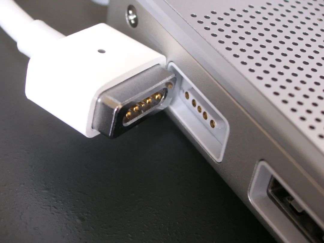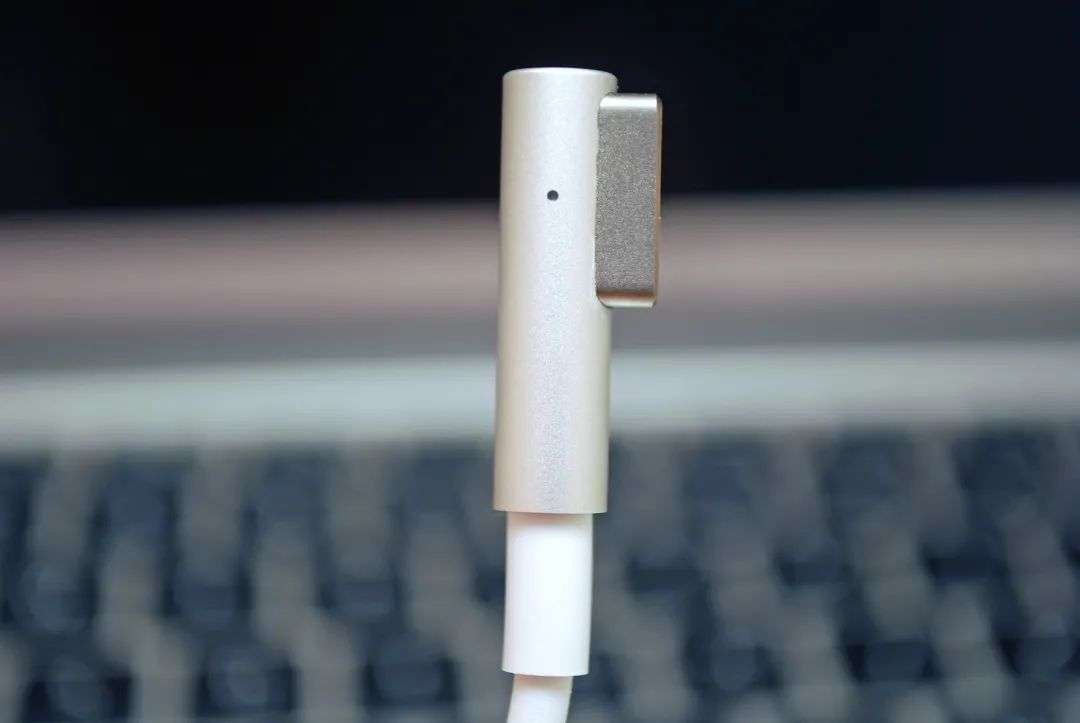 2006 年苹果在第一代 MacBook Pro 中引入 MagSafe 设计,接口内部的 5 个金属插脚,磁性为回文设计,所以它可以从正反两面吸附,不用刻意对准。插头正反两面都有指示灯,绿色代表充满,红色正在充电。这个设计后来成为 MacBook 上的标志性功能。