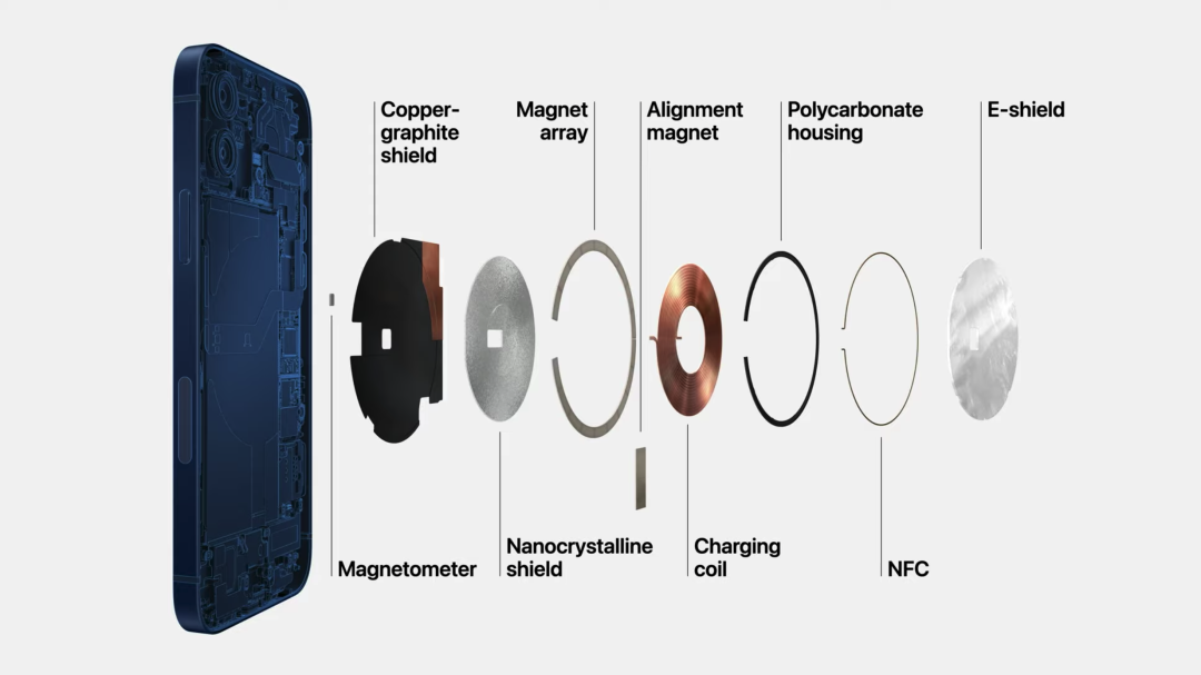 先来说说它现阶段的样子。首先手机上的 MagSafe 已经不只是磁吸接口,它代表的是一整套设计理念。iPhone 12 内部集成了充电线圈和磁铁阵列,能正确对到无线充电器的位置上,实现高效充电。MagSafe 磁吸配件中也包含对应磁体,可以轻松吸附,并且「叠加」使用。
