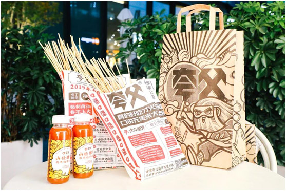 方便走食,具有天然传播性。乐山炸串的另一大特点是一口串,非常方便走食,外卖和外带属性明显。而走食的另一大好处就是具有天然传播性,食品和包装本身,都自带广告效应。与此同时,夸父炸串也将这一优势放到更大,比如将包装袋设计成30cm高,串签设计成40cm长,故意漏出10cm签子来激活大众认知,包装袋也进行了醒目潮流的设计,让顾客成为行走的“天然广告机”。