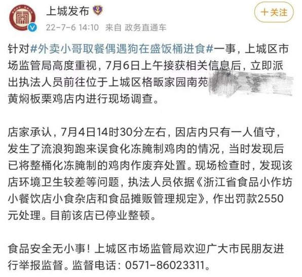 7月6日,针对“外卖小哥取餐偶遇狗在盛饭桶进食”一事,杭州上城区市场监管局高度重视,7月6日上午接获相关信息后立即派出执法人员前往位于上城区格畈家园南苑9排24号的欧巴黄焖板栗鸡店内进行现场调查。