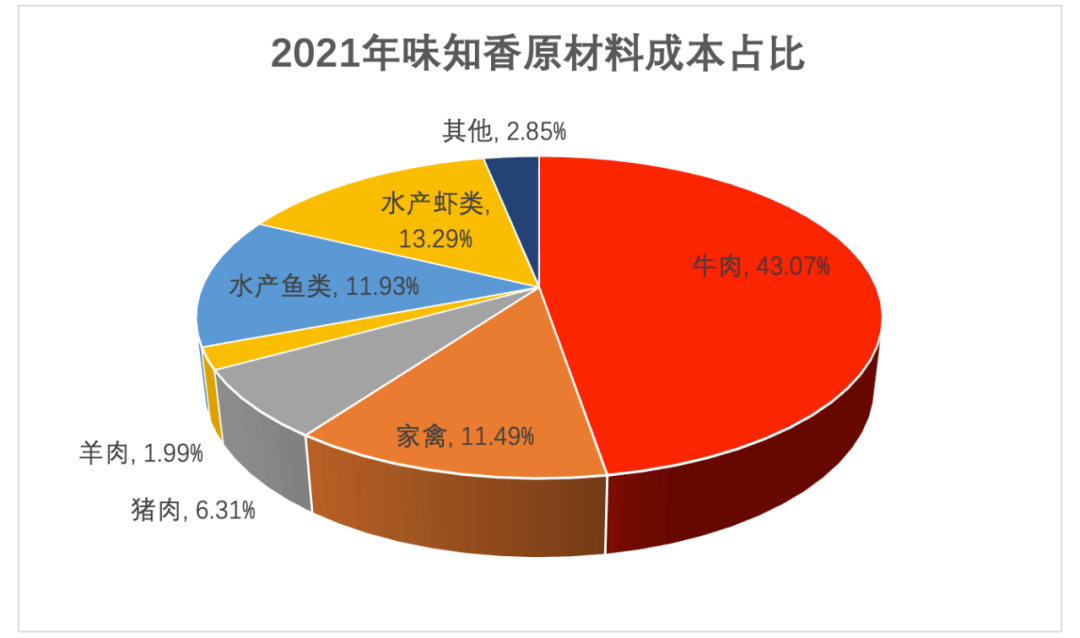 味知香2021年年报显示,原材料成本占主营业务成本的90.93%,其中肉禽类成本占比62.86%,鱼虾类占比25.22%。味知香采购的家禽类细分品种较多,其中占比较大的鸡大胸采购价格与农业部发布的白条鸡批发价相比,基本都低于市场价。