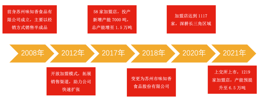 2021年4月27日,味知香在上海证券交易所正式上市,成为A股第一家半成品菜上市公司,此后,味知香在产品、渠道上频频发力,不断发展、扩张。