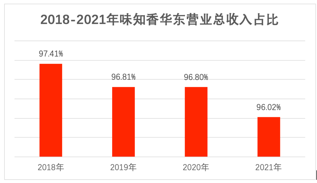 还有最重要的一点,味知香作为一家区域性企业,其业绩也过于依赖华东地区的发展。2021年味知香华东地区实现收入7.24亿元,占全年主营业务收入的96.02%。2018-2021年华东地区的销售额占总销售额的比重分别为97.41%、96.81%、96.80%和96.02%。过于依赖华东地区的风险是,一旦发生类似于3-4月份上海疫情导致江浙沪门店被大规模封控,将极大影响到其1-2季度业绩。