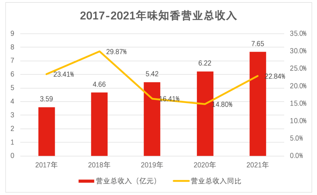 财报披露,2021年菜品种类也从前招股书披露的200余种,增至了300种以上。2021年营业收入7.65亿元,同比增加22.84%,归属上市公司股东净利润为1.33亿元,同比增加6.06%;预制菜占比为98.61%。零售渠道(经销店和加盟商)占比62.39%,其中加盟店收入3.47亿元,经销店收入1.30亿元。针对B端批发渠道收入为2.43亿元,占比为31.78%。从收入增速看,味知香2017年到2021年收入同比增长分别为23.41%,29.87%,16.41%,14.80%和22.84%。