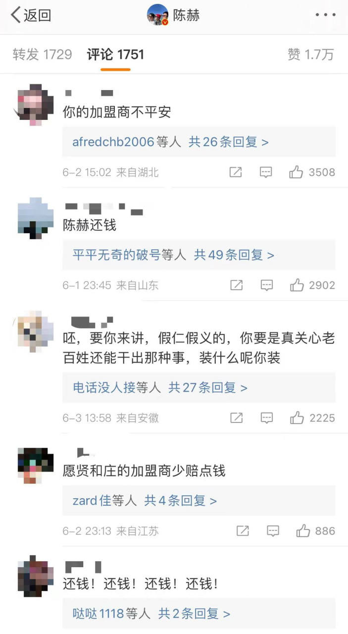 持股比例达38.5%,陈赫作为最大股东持股的福建贤合庄品牌管理合伙企业,事发后已经退出了贤合庄的股东位置,在顺利完成收割后又悄然神隐,甚至连此前因贤合庄食品卫生和食品安全隐患等问题转发的致歉微博也一并删除,只剩下孤立无援的加盟商叫苦不迭。