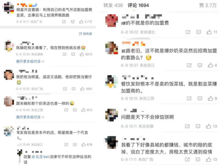 在微博热搜的评论下,网友们的评论一针见血,有的称“这不就是旧瓶装新酒,只是套上明星的光环的加盟骗局”,“我把他当明星,他却把我当猪仔”的评论则显得又滑稽、又心酸。