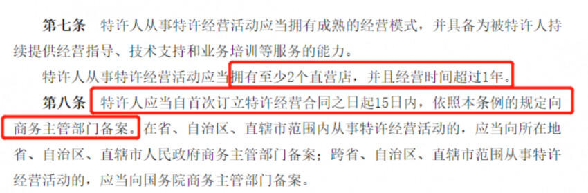 相关资料显示,成立于2020年的天然呆在21年就开展了特许经营活动,与众多代理以及加盟商签订加盟合同,然而成立未满一年的商户按理说是不具备特许经营资质和条件的。