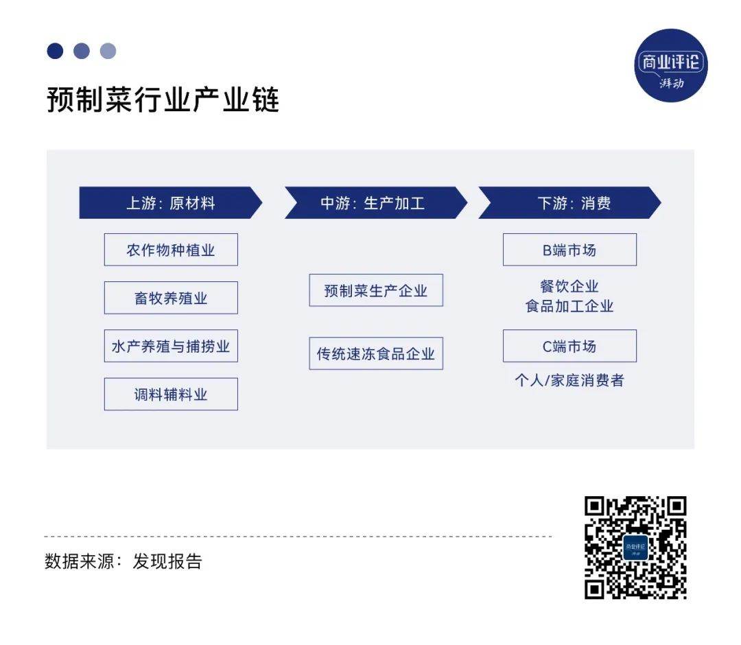 “预制菜”的前身是料理包,并不是一个全新的产品,过去主要是服务B端餐饮相关行业。产业在冷链物流技术发展,农牧业工业化程度提高等条件支持下,早已成为一个成熟、体量庞大的餐饮前端产业链。