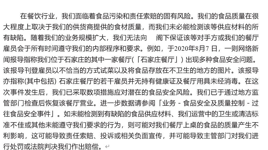 2020年,#绿茶餐厅服务员上菜前徒手抓菜吃#的话题引起了网民以及消费者们的热议。据新京报报道,绿茶餐厅石家庄一门店被曝出食品安全问题,当地的监督管理局也介入了调查。在招股书中,绿茶集团对此也有描述。