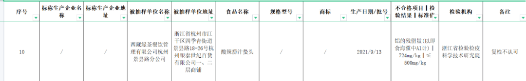 除此之外,2021年根据浙江省市场监督管理局发布的一则食品安全监督抽检信息通告(2021年第44期),其中,西藏绿茶餐饮管理有限公司杭州景昙路分公司加工自制的酸辣捞汁蛰头,(生产日期/批号:2021/9/13),铝的残留量(以即食海蜇中Al计)检测值为724mg/kg,标准规定为不大于500mg/kg。