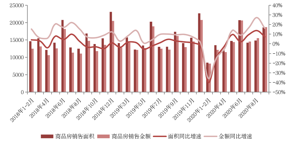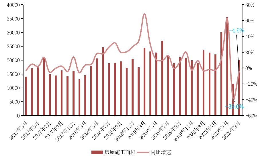 数据显示,商品房销售面积、金额同比增速出现回落,9月全国商品房销售面积、金额同比增速分别较8月收窄了6.4个百分点和11.1个百分点,整体市场成交后劲不足。叠加8月底披露的房企融资“三条红线”新规,新开工、土地购置均出现明显放缓态势。但房地产开发投资在建安投资强力支撑下(施工面积增速提升35个百分点)仍有较强韧性。