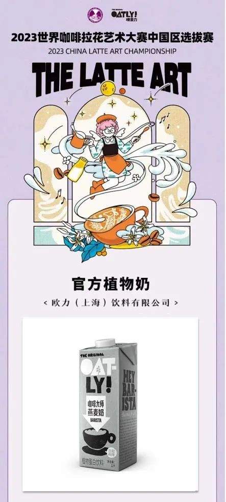 OATLY表示,经过多轮次的双向匹配,中国工厂生产的咖啡大师燕麦奶,已被2023世界咖啡拉花艺术大赛中国区选拔赛选定为官方植物奶,将陪伴专业咖啡师们征战世界级的赛场。
