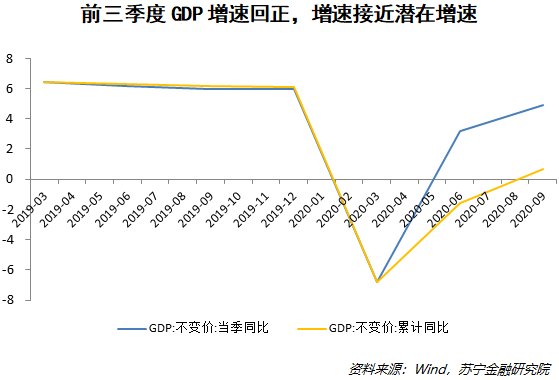中国成为全球唯一一个走出“V”型复苏的主要经济体。三季度GDP当季同比4.9%,累计同比0.7%,符合预期。经济增速逐渐接近潜在增速的同时,结构性分化的问题有所缓解:工业部门持续繁荣,9月工业增加值同比6.9%,继续高增;9月社零总额同比3.3%,也超预期;更为重要的是,限额以下的终端消费当月同比首次转正,达到1.2%。
