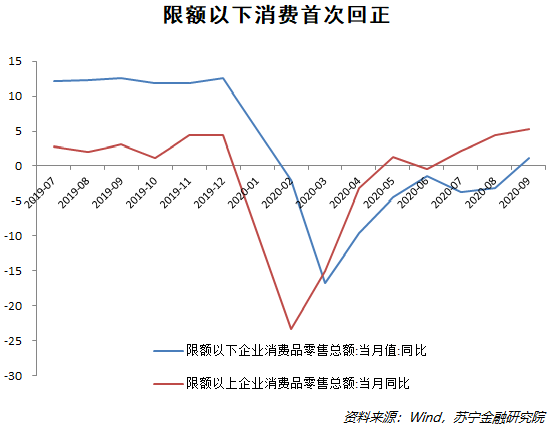 二是在消费方面,限额以上(基本对应中高端消费需求)恢复相对较快——9月限额以上社零同比5.3%,其中9月汽车销量同比增长12.9%,增速继续提升。同时,预计限额以下首次回正会对未来消费继续平稳复苏打下更好基础。