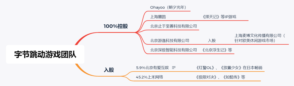 字节跳动的游戏布局起始于2018年,在两年多的时间里它通过收购+自组建的方式迅速打造出了自己的一支游戏团队。下图列举了一些字节跳动目前完全控股和投资的游戏公司,都是在游戏领域有所擅长和积淀的企业。
