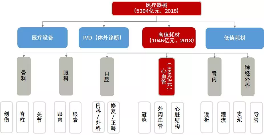 按分类来看,医疗器械分为高值耗材、低值耗材、医疗设备和体外诊断(IVD)等。其中,冠脉支架属于使用最为广泛的高值医疗耗材之一。