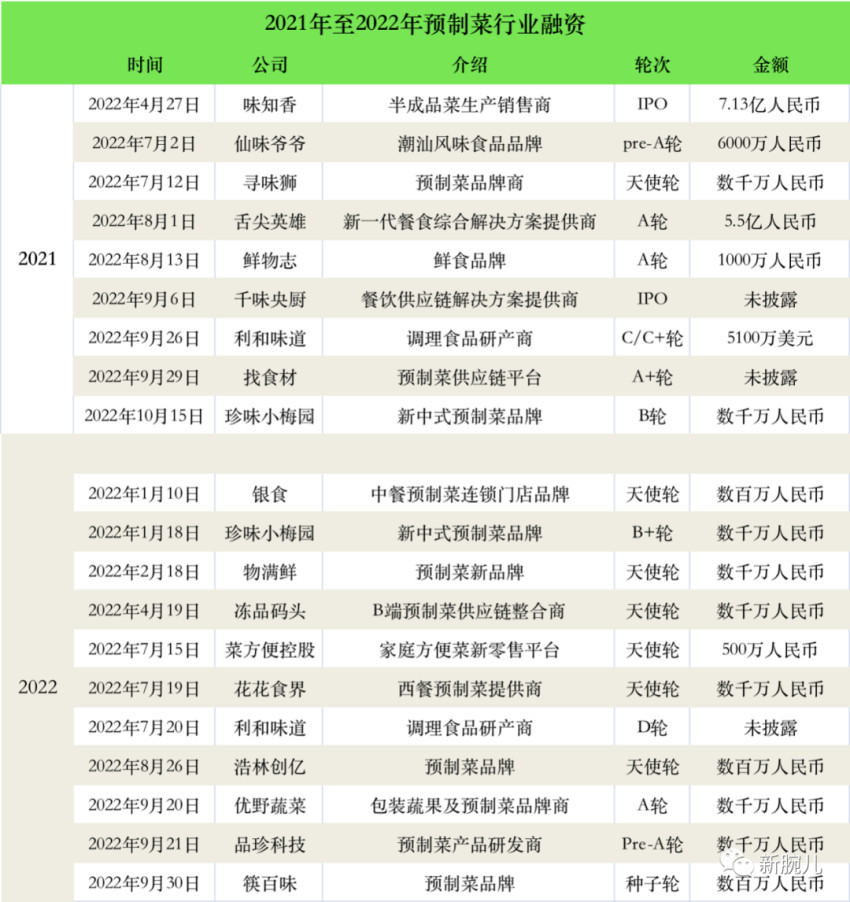新腕统计了2021年至2022年国内预制菜行业融资列表。