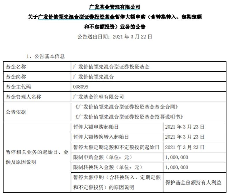 近日,广发价值领先混合发布了暂停大额申购业务的公告。公告显示,为了保护基金份额持有人利益,自2021年3月23日起,该基金暂停投资者单日单个基金账户通过申购(含转换转入、定期定额和不定额投资)合计超过100万元的大额业务。
