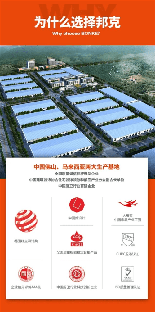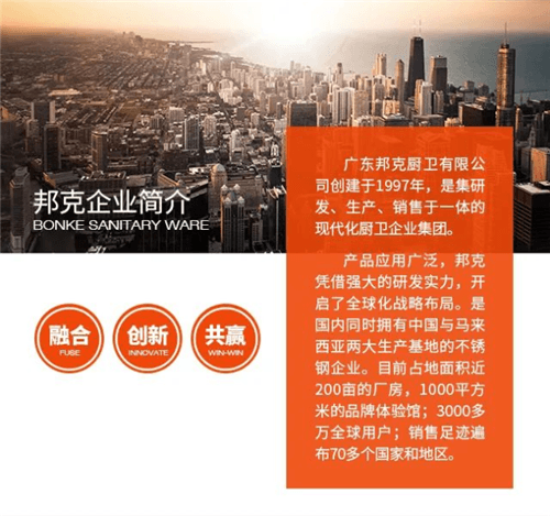 邦克不锈钢厨卫五金产品远销全球70多个国家和地区,品牌和服务获得众多客户盛誉;自有中国与马来西亚两大生产基地,配合自动化生产线,实现匠心智造;产品原材料严格甄选食品级304不锈钢,品质效果卓著;24年经验积累,24小时专业服务,一对一技术指导,全力配合合作伙伴,共同发展。