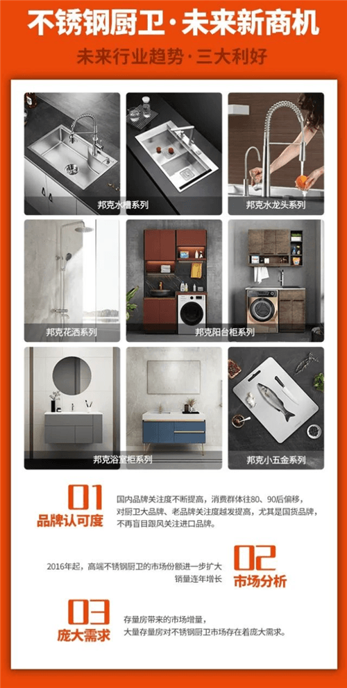 与此同时,科技与时代擦出的火花在各个领域都引起一片火热,厨卫五金行业同样如此。在科技与智能的赋能之下,万物互联的今天,兼具科技性与设计感的家居建材和五金产品更能吸引青睐。作为厨卫行业领军品牌,邦克厨卫发展势头迅猛,为进一步抢滩市场,完善品牌布局,邦克厨卫现面向全国火热招商。