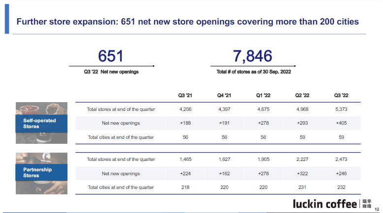 一方面通过自营门店在一二三线城市不断加密布局,另一方面通过联营合伙人模式快速下沉到更广阔的低线市场。拆分最新发布的三季报数据,在瑞幸新开的651家门店中,自营门店是主力军。