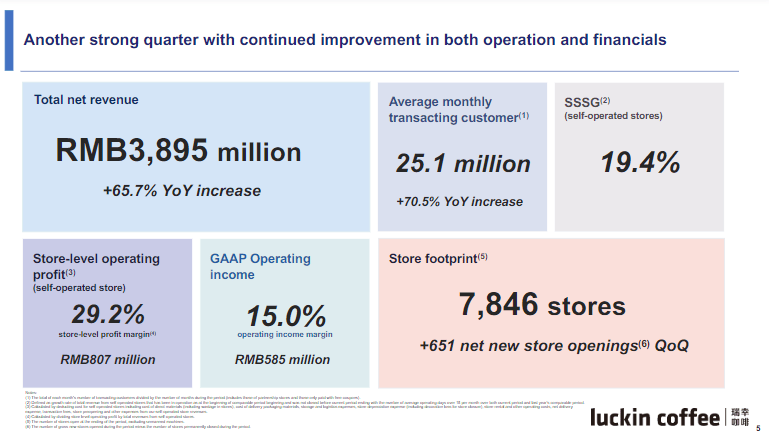 在此之后,得益于其门店的持续扩张、交易客户数的稳步提升、商品销量的增多,瑞幸第二季度总净收入增长72.4%,达到32.99亿元。