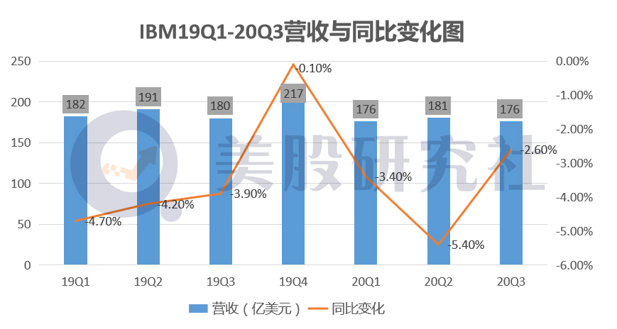 美东时间10月19日盘后,IBM对外发布2020财年第三季度的财报,财报公布后,刺激其股价在盘后交易中下跌约3%。虽然其股价下跌不无受三大股指集体下行的影响,但高于大盘的跌幅也表明了资本市场对这份财报的态度。截至美股研究社发稿,IBM盘后每股报121.88美元,盘后下跌2.90%,总市值为1117.85亿美元。