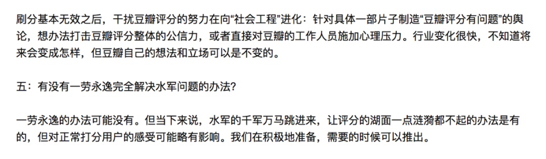 作为一个资深且活跃的豆瓣用户,娱sir记得阿北在2015年那篇《豆瓣电影评分八问》的文章里就提到过,因为分数算法的难以操控,针对具体片子的舆论会想办法 “打击豆瓣评分整体的公信力”。