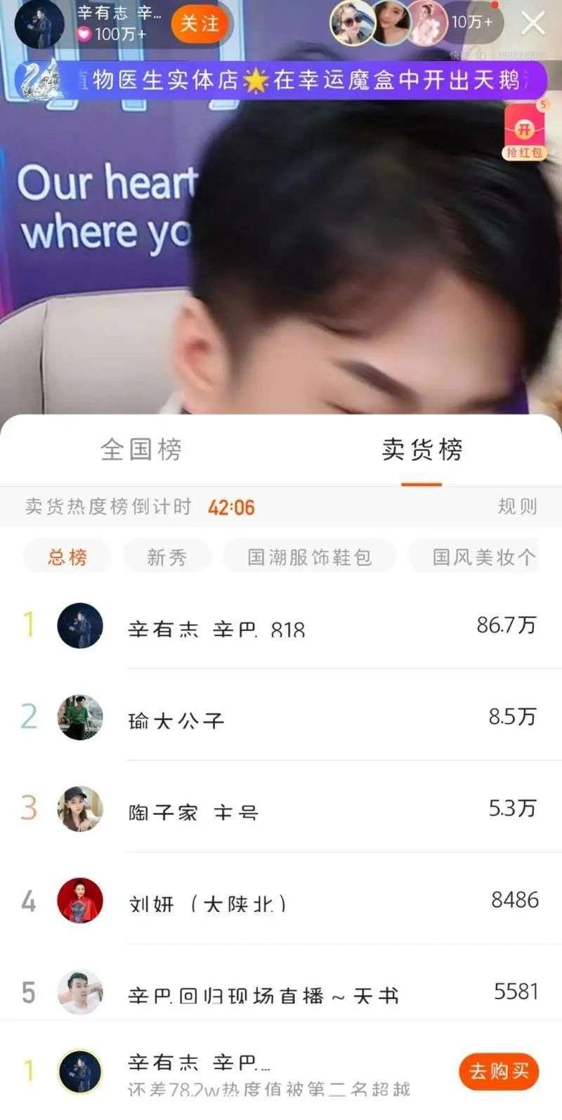 辛巴开播后的直播销售热度榜。图片来自于快手截图